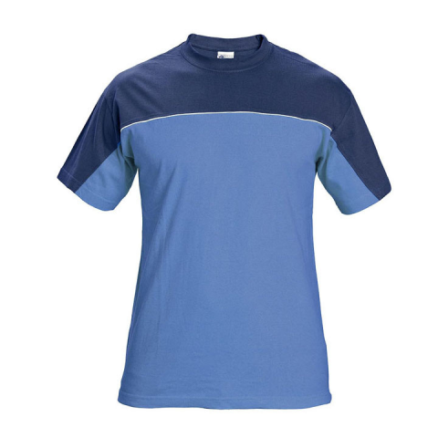 Pamut, kereknyakú póló Alapanyag:100 % pamut, 155 g /m² A termék megfelel az EN 340 szabványnak. Minőségi kétszínű rövid ujjú póló Nyakán rugalmas szegéssel (5 % elasztán) Szín: Világoskék / Sötétkék Méret: S,M,L,XL,XXL,3XL,4XL