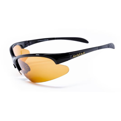 Sportnapszemüveg borostyánszínű HD és polarizált lencsével, fekete műanyag kerettel.