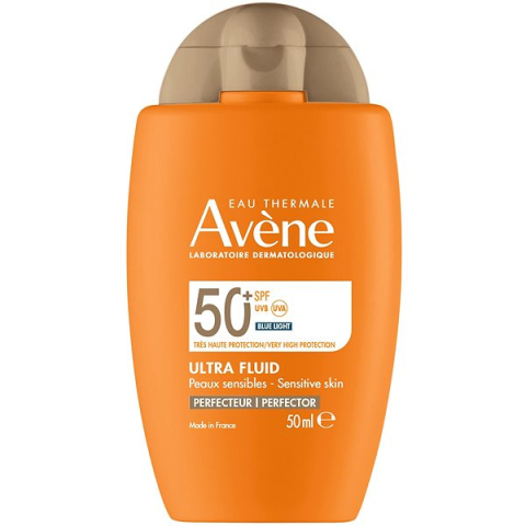 Napozókrém - 50 védőfaktoros, érzékeny bőrtípusra ajánlott, arcra, dermo kozmetikum, 50 ml-es AVENE Sun Ultra fluid Perfector SPF 50+ napozókrémAz Avène Sun Ultra fluid Perfector egy ultra-könnyű, színezett arcvédő krém felnőtteknek az UVB, UVA, HEV kék fény és a légszennyezés ellen. A bőrre k