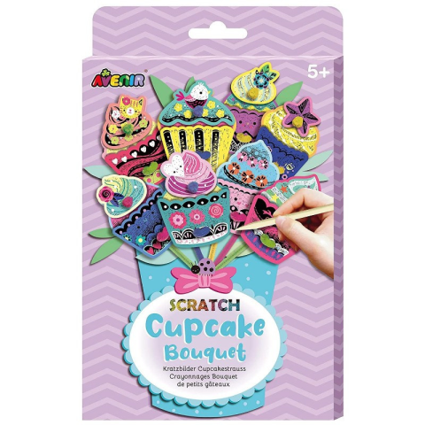 Szórakoztató karcolós foglalkoztató készlet a gyerekeknek, amellyel gyönyörű, cupcake-témájú csokrokat készíthetnek.A karcoló lapokat, pipatisztítót (fuzzy pálcikákat), csomagolópapírt és szalagot tartalmazó készletben a gyerekek lépésről lépésre követve