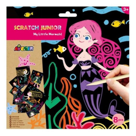 Karckép technika az Avenir-től! A különleges fekete papírlapokat megkarcolva színes hableány rajzokat készíthetsz.A készlet tartalma: 8 karcolható kép, 1 karc eszköz