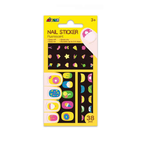 38 db-os fluoreszkáló körömmatrica készlet az Avenir márkától. A matricák a körömről könnyedén lehúzhatók, a maradék ragasztó szappanos vízzel eltávolítható.