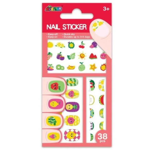 38 db-os körömmatrica készlet az Avenir márkától. A matricák a körömről könnyedén lehúzhatók, a maradék ragasztó szappanos vízzel eltávolítható.