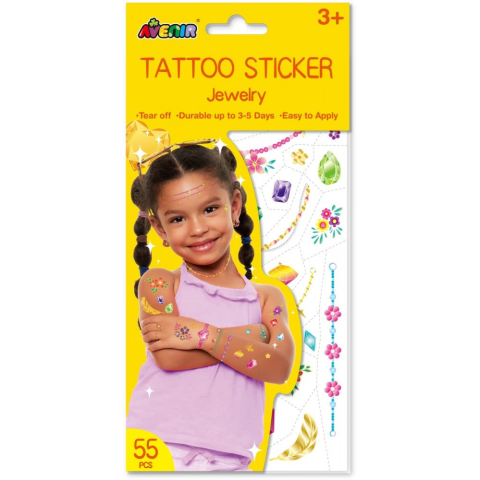 Lemosható tetoválás az Avenir Kids márkától.A csomagban 55 db könnyedén felrakható és lemosható tetováló matrica található.