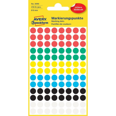 Etikett címke, o8mm, jelölésre, 6 klf. szín 104 címke/ív, 4 ív/doboz, Avery vegyes - AV3090 - Etikettek -