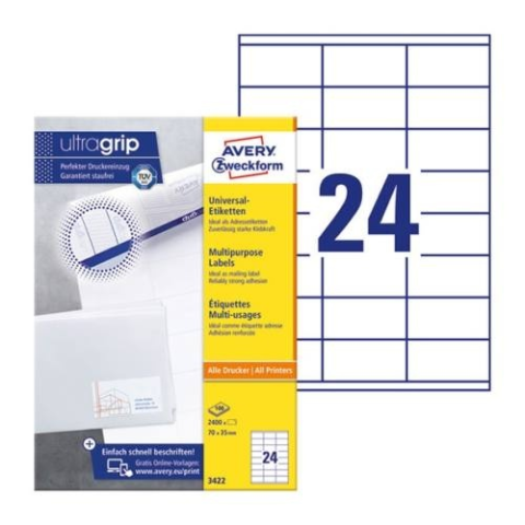 Avery Etikett AVERY 3422 70x35mm univerzális 2400 címke/doboz 100 ív/doboz