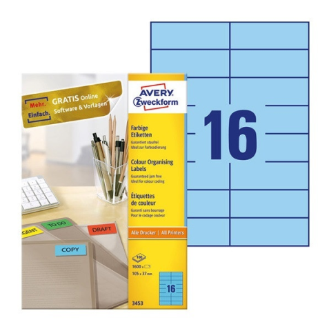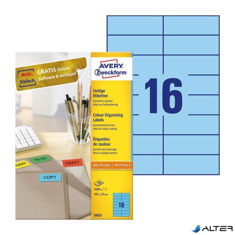 2 kép Avery Etikett AVERY 3453 105x37mm univerzális kék 1600 címke/doboz (100 ív/doboz)