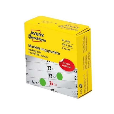 2 kép Avery Etikett AVERY 3855 öntapadó jelölőpont adagoló dobozban zöld 19mm 250 jelölőpont/doboz