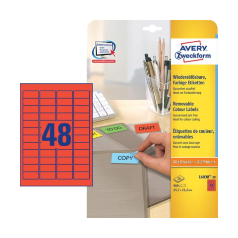 1 kép Avery L6038-20 45,7x21,2mm visszaszedhető 960db-os Etikett Piros