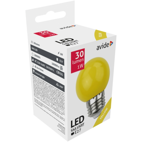 Avide Dekor LED fényforrás G45 1W E27 Sárga – 30 lm, 1 W, IP20 védelem. Ideális csillárokban, falikarokban, asztali és éjjeli lámpákban. Szabályozható fényerejű változatban is elérhető. Egyszerű csere, széles körű kompatibilitás. Avide Dekor LED fényfo