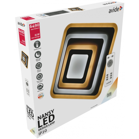 Avide Design Mennyezeti Lámpa Nansy 82W(41+41) RF Távirányítóval – 6490 lm, 82 W, IP20 védelem. Ideális otthoni és irodai belső terek egységes megvilágítására. Letisztult dizájn és harmonikus fényélmény. Egységes világítás nappaliban, hálóban vagy irodába