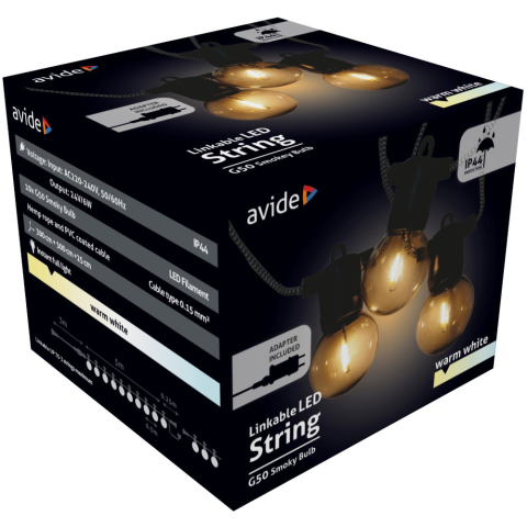Az Avide 5 méteres kültéri fényfüzér füstös burákkal vintage hangulatot áraszt. A melegfehér fények nyugalmat, meghittséget sugároznak, míg a sorolható kialakításnak köszönhetően könnyedén bővítheted a fényfüzér hosszát akár egész kerted köré. Tökéletes választás teraszokra, kerti partikhoz vagy állandó kültéri dekorációnak.