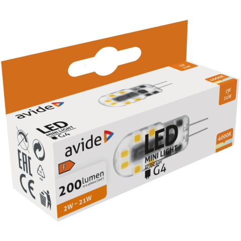 Avide LED 2W G4 NW 4000K Fekvő – 200 lm, 2 W, IP20 védelem. Ideális csillárokban, falikarokban, asztali és éjjeli lámpákban. Szabályozható fényerejű változatban is elérhető. Egyszerű csere, széles körű kompatibilitás. Avide LED 2W G4 NW 4000K Fekvő – 2