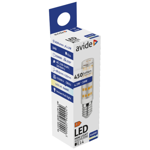 Avide LED 4.2W JD E14 CW 6400K – 450 lm, 4.2 W, IP20 védelem. Ideális csillárokban, falikarokban, asztali és éjjeli lámpákban. Szabályozható fényerejű változatban is elérhető. Egyszerű csere, széles körű kompatibilitás. Avide LED 4.2W JD E14 CW 6400K –