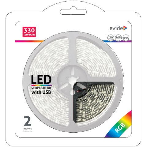 Bliszteres RGB LED-szalag szett, USB csatlakozóval. A szett 2m IP65 védelemmel ellátott LED-szalagot tartalmaz, melynek hátulja öntapadós 3M ragasztóval van ellátva, így egyszerűen felragasztható TV-re, monitorra vagy bármilyen letisztított felületre. A csomag integrált 3 gombos vezérlőt is tartalmaz, mely segítségével állítható a LED-szalag színe, fényereje és különböző módok közül is választhatunk.