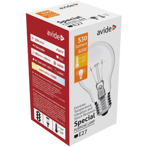 Avide Special Izzó: 60W, 530 lumen, meleg fehér fény 💡 Ez a kiváló minőségű Avide Special izzó tökéletes választás otthonába vagy irodájába. A 60W teljesítmény és az 530 lumen fényáram kellemes, meleg fehér fényt biztosít (2700K). A 360°-os világít...