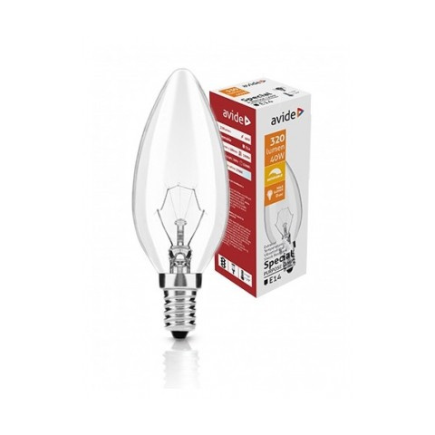 Speciális Izzó C35 40W E14 WW (Avide hőálló) – 320 lm, 40 W, IP20 védelem. Ideális csillárokban, falikarokban, asztali és éjjeli lámpákban. Szabályozható fényerejű változatban is elérhető. Egyszerű csere, széles körű kompatibilitás. Speciális Izzó C35