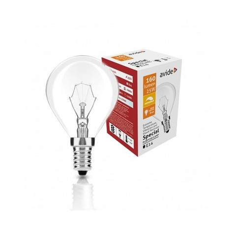 Speciális Izzó P45 25W E14 WW (Avide hőálló) – 160 lm, 25 W, IP20 védelem. Ideális csillárokban, falikarokban, asztali és éjjeli lámpákban. Szabályozható fényerejű változatban is elérhető. Egyszerű csere, széles körű kompatibilitás. Speciális Izzó P45