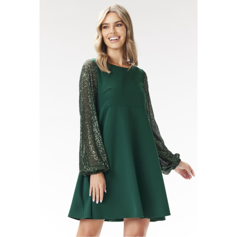 Női Estélyi Ruha Awama MM-204270. Színe: Zöld A cekin díszítésű mini trapézruha. Elegáns mini trapézruha cekin díszítéssel a lengyel Awama márkától. Ideális különleges alkalmakra, mint például randevúk, színházi előadások vagy ünnepek. A trapéz szabás finoman elfedi az alakot, könnyedséget és kényelmet biztosítva viselés közben. A cekin díszítésű ujjak fényt adnak és vonzzák a tekinteteket. Az enyhén kerek dekol