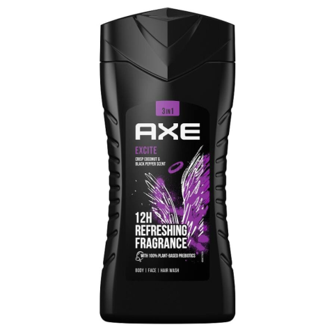 Az Axe Excite Tusfürdő olyan istenien férfias, hogy csábító illatától még az angyalok is bűnbe esnek. Az AXE tusfürdők hosszantartó illatukkal segítenek megőrizni a frissességet. A bőrgyógyászatilag tesztelt 3in1 tusfürdők különleges zuhanyzási élményt adnak. Használhatod őket testre, arcra és hajra egyaránt.