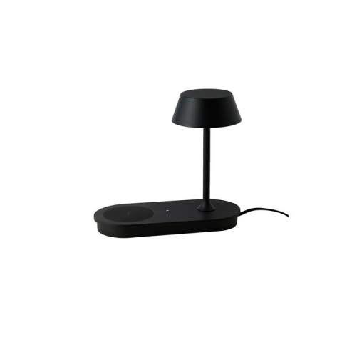 Modern stílusú, fémből készült asztali lámpa, amely USB csatlakozóval és NFC (vezeték nélküli) töltési lehetőséggel is rendelkezik...