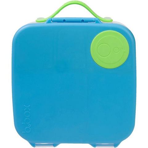 Uzsonnás doboz - osztott, űrtartalma 2 l, mérete 6,5 × 21,5 × 23,5 cm (Ma×Sz×Mé), fedél klippes rögzítéssel, hordozó fül a csomag része, anyaga szilikon és polipropilén, kék és zöld kivitel A praktikus b.box uzsonnás doboz szilárd kapcsokkal ellátott, biztonságosan lezárja a tartalmát, és 2 l nagyságú. Kombinálja a kivehető betétet a rugalmas válaszfallal a változatos elrendezés érdekébe