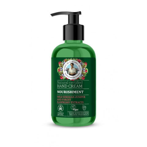 Babushka Agafia bio kézkrém tápláló vad szibériaiboróka és erdeimálna kivonattal 300 ml A rendkívül tápláló krém használatának köszönhetően keze bársonyos és puha lesz. Vad szibériai borókakivonat hatékonyan puhítja és táplálja, bio erdeimálnakivonat m