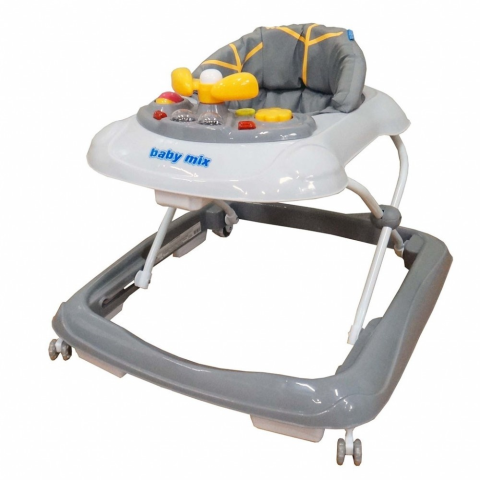 Multimédiás bébikomp Baby Mix szilikon kerekekkel. A bébikomp kényelmes, ergonomikus alakú üléssel van felszerelve, amely biztosítja a gerinc helyes tartását. A játék pult különféle fényekkel, forgatható dudáló kormánykerékkel és dallamok lejátszására szo