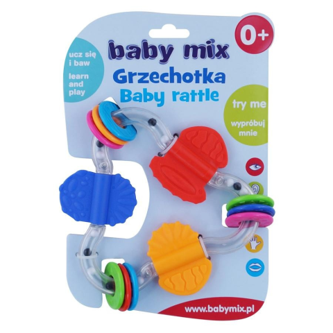 Baby Mix csörgős játék. 0 hónapos kortól ajánlott, rögtön a születés után. Méretek: 11 x 7,5 x 4 cm