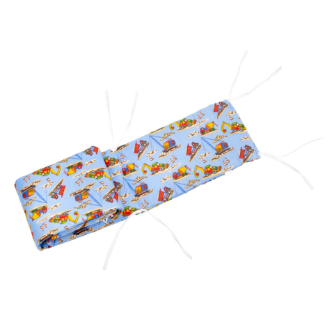 a fejvédőt a kiságy belsejében a fejrésznél félkör alakban a rácshoz kötjük, így a kisbaba véletlenül sem üti be a fejét a rácsokba többféle színben és bájos mintákkal kapható anyaga: 67% pamut, 33% poliészter, a töltőanyag 100% műszál mérete: 20x140 cm