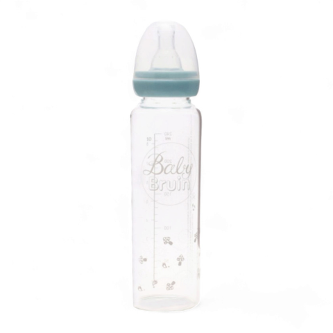 1 kép BABYBRUIN Hőálló üveg cumisüveg, szilikon etetőcumival, cseppmentes kupakkal 240 ml - kék