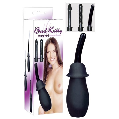 Bad Kitty - Intimmosó A szett tartalma: 1db 100ml-es ballon 1db sima, eyhén hajlítot feltét 1db spirális felszínű feltét 1db kúpos végű feltét A tökéletes intim higiéniáért! A 150ml-es gumiballon 12cm magas; három típusú cserélhető zuhanyfejjel: hajl