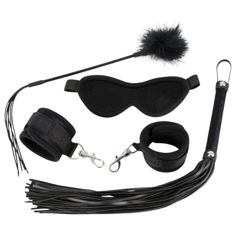 Bad Kitty - Fetish szett - fekete 5 részes szett. Tartalma: -1 szemmaszk, rugalmas fejpánttal -1pár puha csuklóbilincs, tépőzáras kialakítással, fém karabinerrel -1 minikorbács (kb. 40cm hosszú) -1 toll cirógató (kb. 30cm hosszú). Anyaga: Polyurethan,
