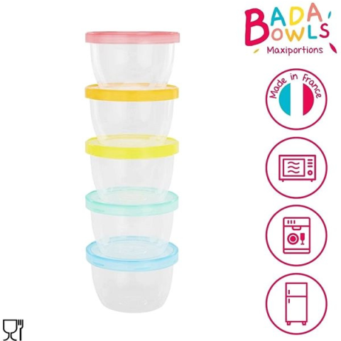 Ételtároló doboz szett - 5 misek s barevnými víčky, pro dětská jídla, vhodná do chladničky, mrazáku i mikrovlnky, bez obsahu BPA, stohovatelné, objem 250 ml Významné přednosti sady dóz BADABULLE MAXI FUN COLORS 250 ml, 5 ks Sada dóz Badabulle uchová potraviny déle čerstvé