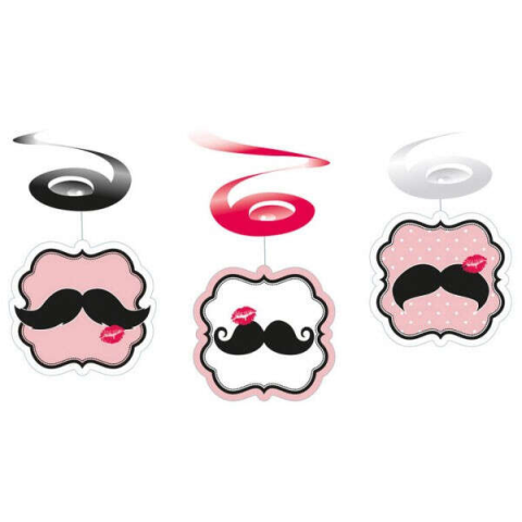 Bajusz és Csók Spirál Dekorációk - 6 db-os szett 💋 Vidám és egyedi dekoráció esküvőre, születésnapra vagy bármilyen partira! Ez a 6 db-os szett 3 különböző mintájú spirál dekorációt tartalmaz: 3 darab rózsaszín alapon fekete bajusszal és piros csókka...