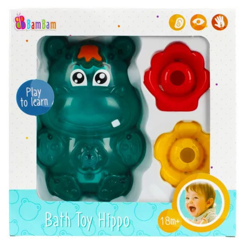 Hippo, Viziló fürdőjáték A viziló fürdőjáték, örömet okoz a kicsinek az esti fürdési rituálé során, a hasára rakható színes virág fröcsköli a vizet. A virágokat a hippi hasán lévő megfelelő lyukakhoz illesztve a kisgyermek kognitív és manuális készségeit