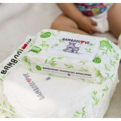 BambooLove környezetbarát, könnyen lebomló, eldobható popsitörlő (60 db) Környezetbarát bambusz termék. 99,3 %-a víz. Kellemes tapintású, illatanyag és kemikáliamentes, klórmentes, bőrbarát termék