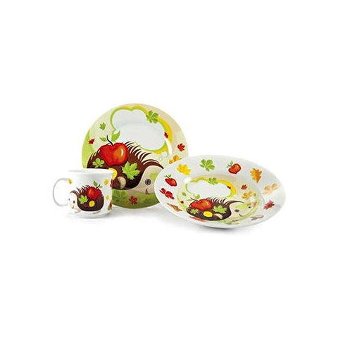 Gyerek étkészlet - kerámia, a csomag tartalma bögre és 2 tányér, alkalmas mikrohullámú sütőbe és mosogatógépbe, állatkák motívum, fehér, barna és zöld kivitel Gyermek étkezőgarnitúra vidám motívum sün!Gyermek étkezőgarnitúra vidám sün motívummal! Mind kisfiúk, mind pedig kiskislányok figyelmét felkelti már az első pillantban a szépen kidolgozott k