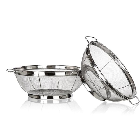 Szita - készlet, 2 db, 21,5 cm és 24,5 cm átmérőjű, anyaga rozsdamentes acél, fogantyú anyaga rozsdamentes acél, mosogatógépben nem mosható A BANQUET AKCENT szűrőkészlet minden konyha praktikus kiegészítője. 2 darab, 21,5 és 24,5 cm átmérőjű szűrőt tartalmaz, amelyek gyümölcsök, zöldségek és tészták öblítésére használhatók. Kiváló minősé