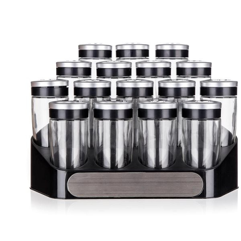 Asztali fűszertartó - 17 darabos készlet sóhoz, borshoz, cukorhoz és fűszerekhez, anyaga üveg, műanyag és fém, űrtartalma 95 ml, magassága 185 mm Minden szakácsnő értékelni fogja a lehetőséget, hogy a főzéshez szükséges fűszereket szépen együtt, ugyanakkor rendezetten tárolja. A BANQUET Altima készlet egy elegáns ABS műanyag állványt kí