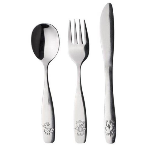 Gyerek evőeszköz - mosogatógépbe alkalmas, acél, hossza 12 cm, kanál, villa és kés a csomagban, ezüst színben Az apróságok biztosan szeretni fogják ezt a három darabból álló gyermek evőeszközkészletet, amely polírozott acélból készült. Az evőeszközök nyelén lévő képek állatokat ábrázolnak. A kés és