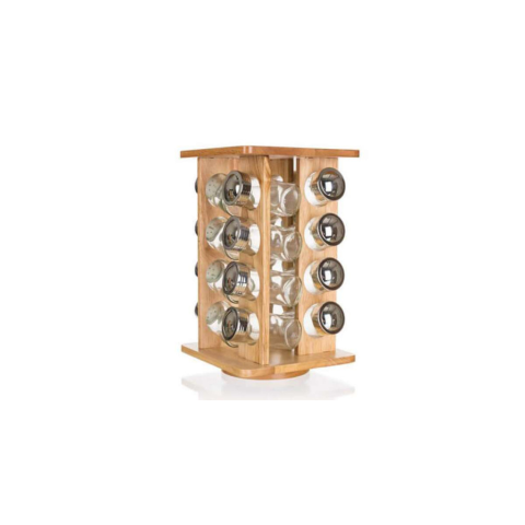 - 16 üveget + állványt tartalmazó szett. - Praktikus, kis helyet foglaló fűszertartó. - Az állvány forgatható, így könnyebb kiválasztani a megfelelő üveget. - A tartók alja üveg, a teteje krómozott műanyag. - Az üvegek nem színeződnek el a benne lévő fűsz