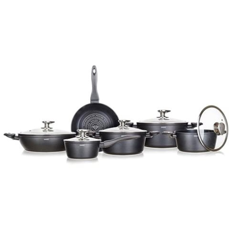 Edénykészlet - gáz, elektromos, indukciós és üvegkerámia főzőlaphoz, 5 fazék és 4 serpenyő a készletben, mosogatógépben mosható, edény anyaga alumínium, fazék külső felülete alumínium, fazék nyelének anyaga műanyag, serpenyő külső felülete alumínium, fedő a csomagban, fekete kivitel A BANQUET DIAMOND Matte Grey edénykészlet jelentősen megkönnyíti a finomságok elkészítését, és a mindennapi főzést. A készlet tartalmaz egy nyeles lábast, 3 fazekat, é
