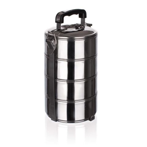 Banquet Ételhordó 4 részes rozsdamentes 48220004 - 4 féle készétel tárolására, hordozására alkalmas - 4db acél tálkát tartalmaz melynek mérete 12,5x5,7cm - Anyagának köszönhetően rövid ideig a meleget is tárolja - Anyaga: rozsdamentes acél - Űrtartalom: