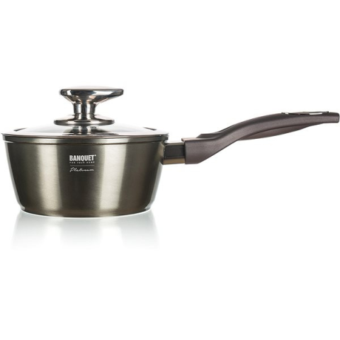 Nyeles lábas alkalmas gáz, elektromos, indukciós és üvegkerámia főzőlaphoz - alumínium belső felület, kerek, 1,25 l-es kiszerelés, tapadásmentes felület és mosogatógépben mosható, 7,5 cm magas, átmérője 16 cm, fedő is a csomag része, barna színben Szeretnéd fejleszteni gasztronómiai tudásod? Akkor a kiváló minőségű Banquet Metallic Platinum 16×7,5 cm, 1,25 l, fedővel nem hiányozhat a felszerelésedből. A praktikus nyeles lábas kapacitása 1,25 l,