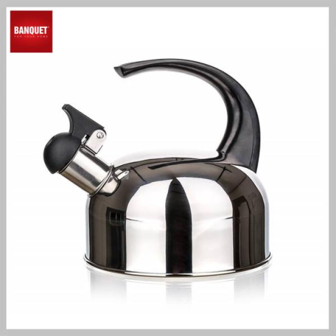 BANQUET Rozsdamentes acél vízforraló CARA 1,3L 48760120A CARA 1,3 l-es rozsdamentes acél vízforraló minden háztartás szerves része. 201-es rozsdamentes acélból készült, rozsdamentes acél vastagsága 0,33 mm, alja 18/0, fogantyúja fekete - bakelit. A vízforraló hangjelzéssel van felszerelve a forrásban lévő vízről – egy beépített síp jelzi a forráspontot. A vízforraló minden típusú főzőlapon használható, beleértve az indukciós főzőlapot is.PARAMÉTEREKAnya