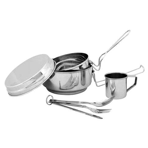 Kemping edény - anyaga rozsdamentes acél, 7 darabos készlet, készlet tartalma bögre, evőeszköz és csajka, Ön a kalandok szerelmese, szeret utazni és kempingezni? Nem kell nagy felszerelés az étkezéshez, ezért válassza a Banquet kemping edénykészletet. Kiváló minőségű rozsdamentes acélb