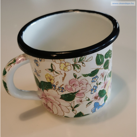 Kívül-belül zománc bevonatos bögre. Mosogatógépben mosható. Tűzhelyen melegíthető. Méret: Ø 9,3 cm, magasság: 8,2 cm, szélesség füllel: 12 cm, kapacitás: 0,4 liter Szín: fehér virágos