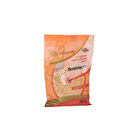 Barbara gluténmentes tészta betűtészta 200 g Összetevők: kukoricakeményítő, tojás, rizsliszt, kukoricaliszt, burgonyapehely, szójaliszt, burgonyakeményítő, sűrítőanyag (guar-gumi), emulgeálószer (zsírsavak mono- és digliceridjei), növényi rost.