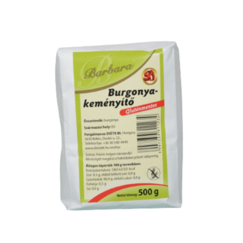 Barbara gluténmentes burgonyakeményítő 500 g A burgonyakeményítő a konyha varázslatos titkaként szolgál. Használható sűrítőként levesekhez és szószokhoz, és tökéletesen működik sütéshez és főzéshez is. Összetevők: burgonya